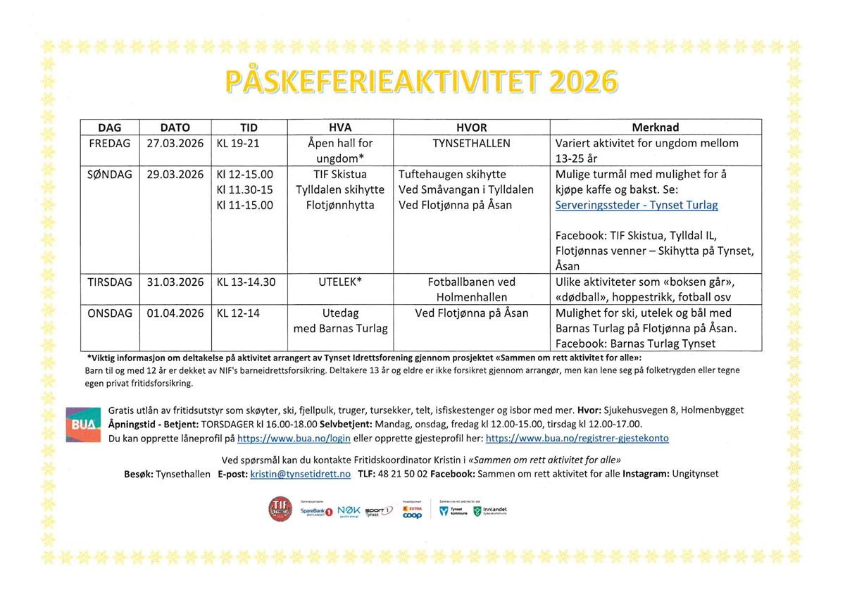 Aktiviteter å gjøre/ delta på i påskeferien for barn, ungdom og familie. Publisert av Bodil Langtjernet Vingelsgaard Publisert 25.03.2026 13.34 Sist endret 25.03.2026 13.37