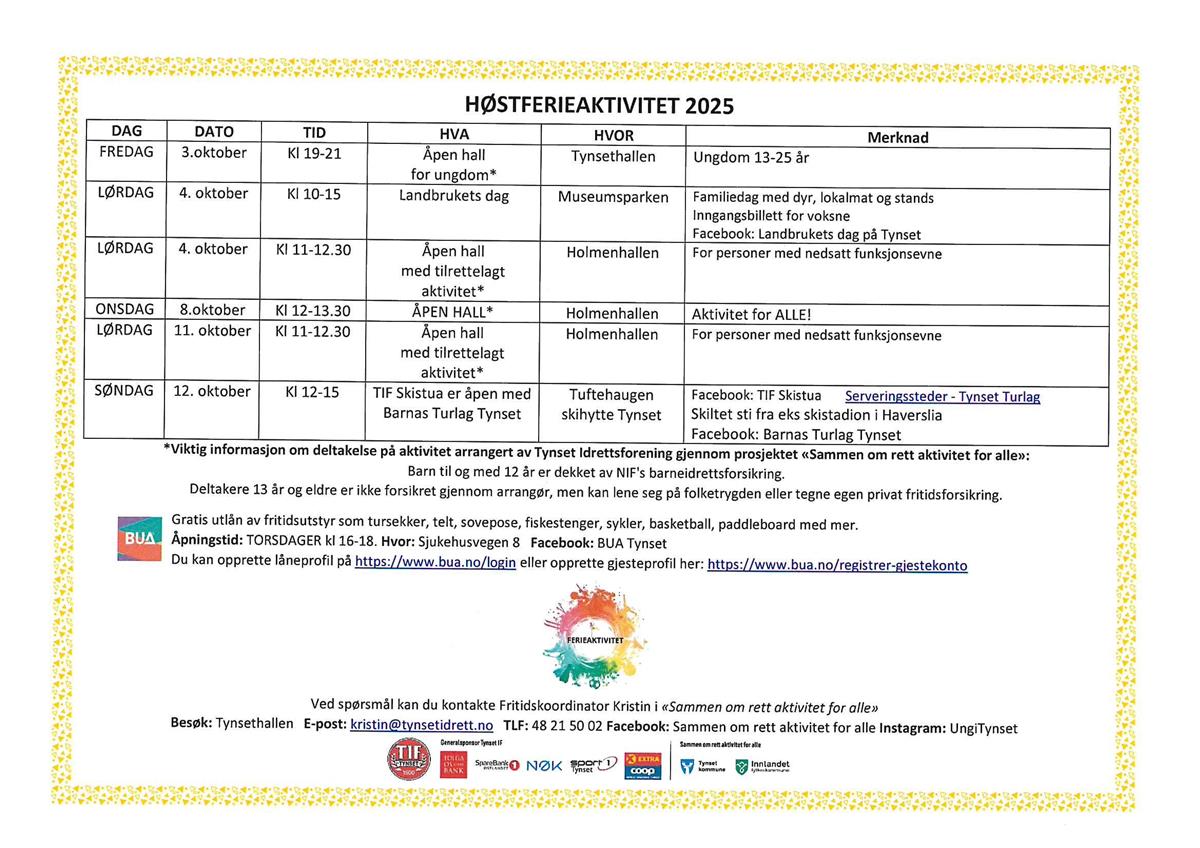 Høstferieaktivitet 2025Oversikt over høstferieaktiviteter Tynset kommune Publisert av Tone Fiskvik Publisert 29.09.2025 14.41 Sist endret 29.09.2025 14.42
