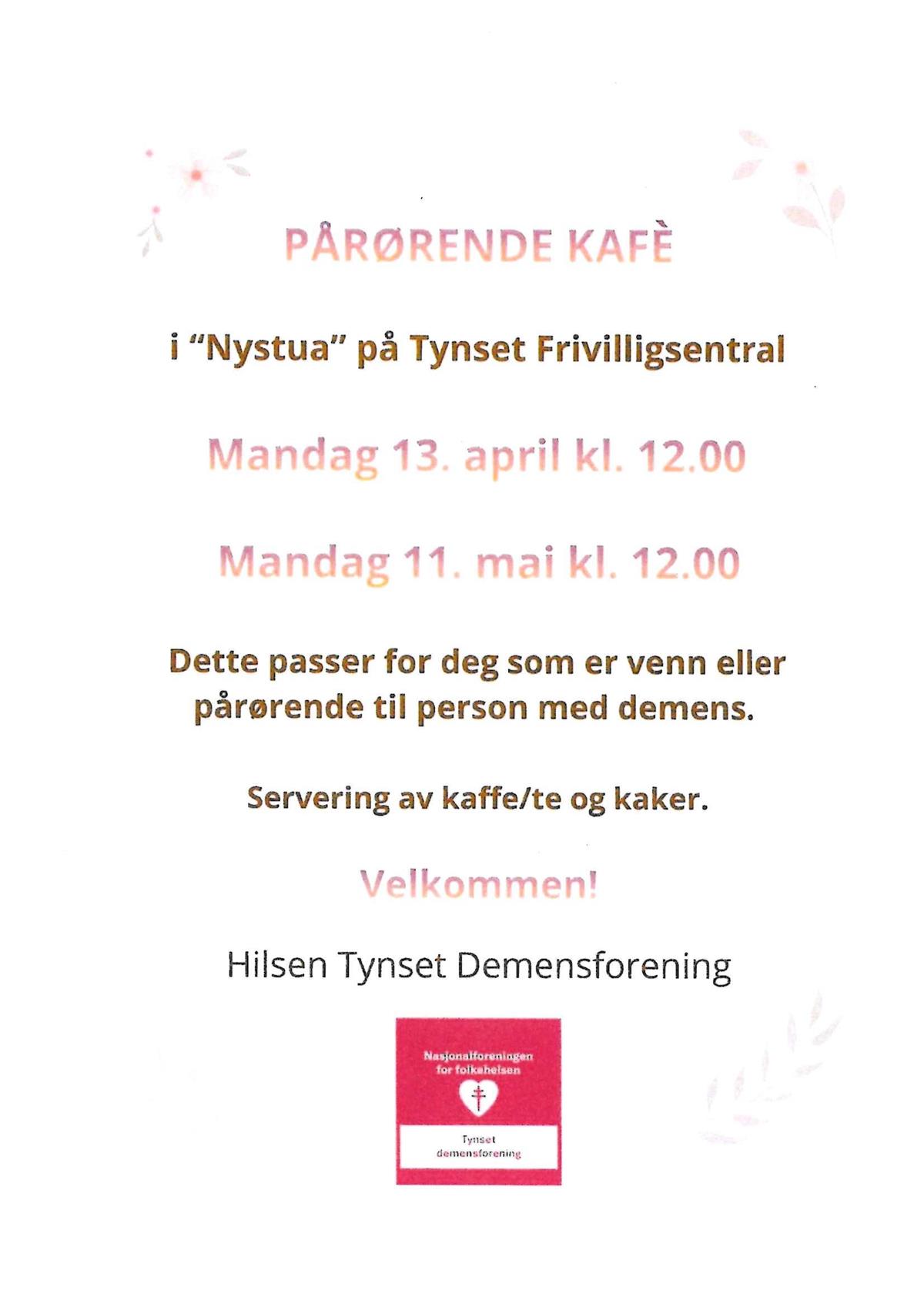 Pårørende kafè for deg som er venn eller pårørende til peron med demenspårørendekafè Publisert av Bodil Langtjernet Vingelsgaard Publisert 08.04.2026 12.26 Sist endret 08.04.2026 12.41