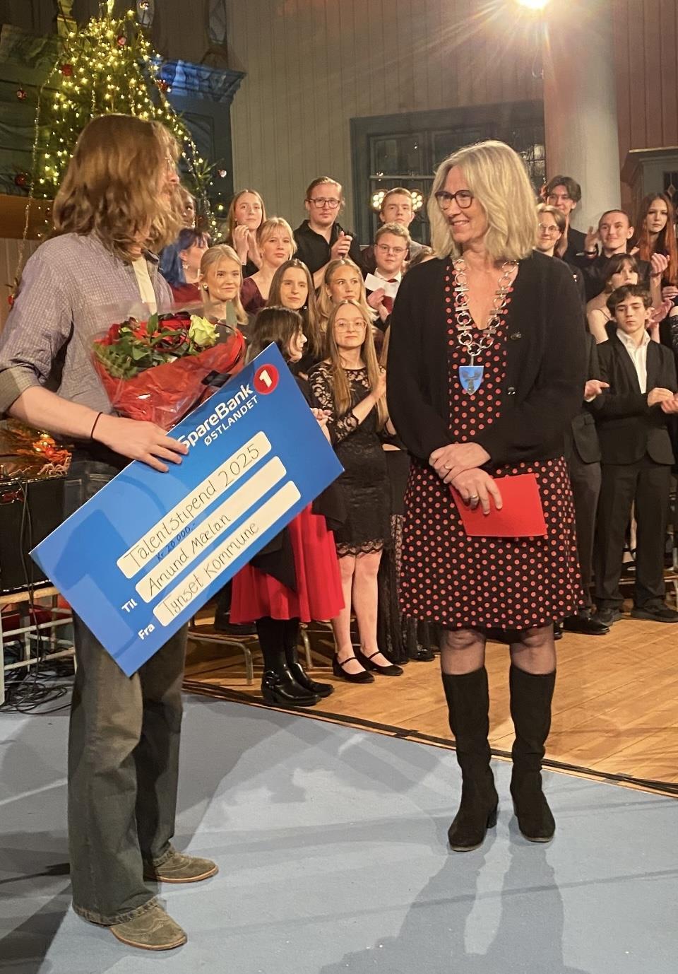 Under den årlige julekonserten til musikklinja ved Nord Østerdal videregående skole ble Amund Mælan (22) tildelt Tynset kommunes talentstipend for 2025 av ordfører Merete Myhre Moen.