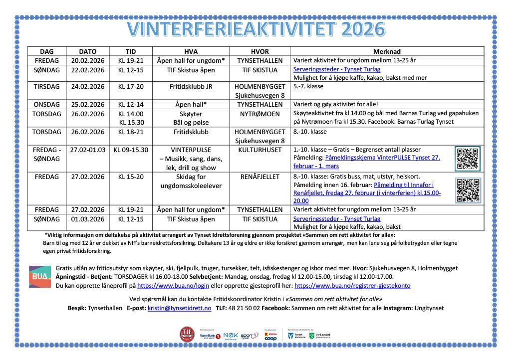 Har du spørsmål angående aktivitetene, kontakt fritidskoordinator Kristin i “Sammen om rett aktivitet for alle” på tlf 48 21 50 02, eller send epost til kristin@tynsetidrett.no
